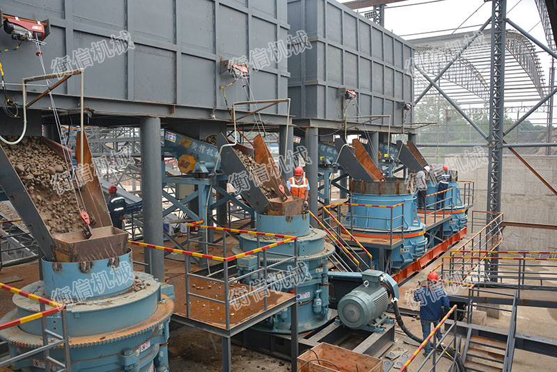 (1)破碎工藝流程:采用顎式破碎機+圓錐破碎機+立軸式?jīng)_擊破碎機(制砂機)三級破碎。